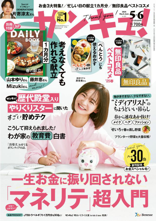 サンキュ!2025年5・6月合併号(3/25発売)「春から速攻垢抜け!メイク・ヘア・ファッション」のページにて弊社のアイテムが紹介されました。