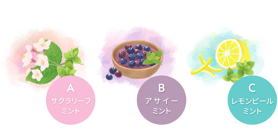 桜をイメージした上品なフレーバー。時間とともにサクランボからスペアミント&リーフへ、さらに柔らかな甘さへと味が変化するのが特長。
