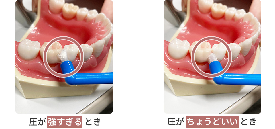 磨くときに「シャカシャカ」「ザッザッ」などの音がする場合は、圧が強い証拠。音をたてないよう心がけると、自然とちょうどいい圧になります。「“磨く”のではなく“毛先を当てる”という意識で」と伝えれば、さらにピンとくるでしょう。