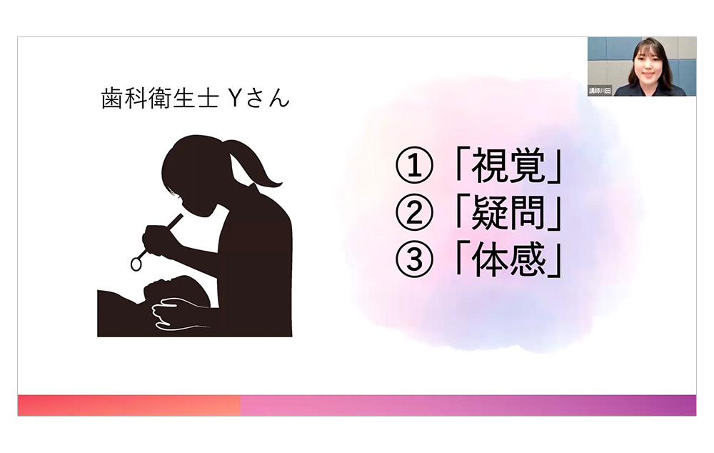 続いて、フロスの提案方法について。臨床現場で働く歯科衛生士の体験談を元に、「視覚」「疑問」「体感」と3つのポイントが紹介されました。