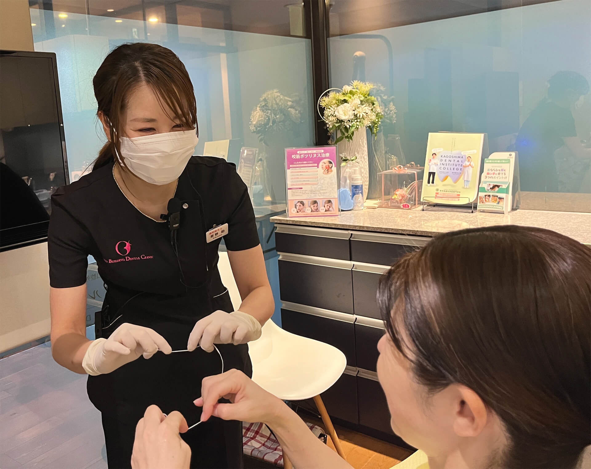 それから、メインテナンスでは必ずフロスの話をするようにしています。染め出しをして、その場で一緒に練習。「中指に巻いて……」というところから、細かくお伝えしています。