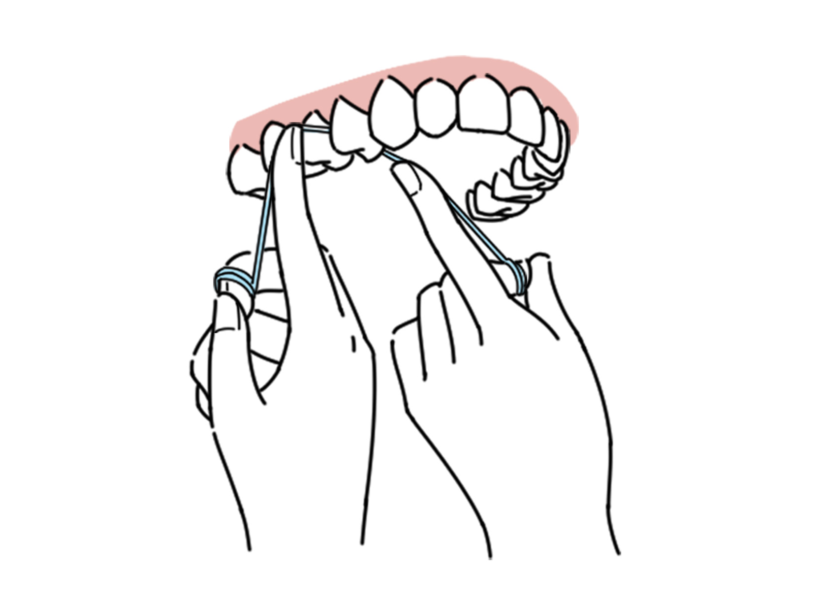 - 前歯の歯間に指で触れ、1本1本数えながら大臼歯までフロスを持って行く