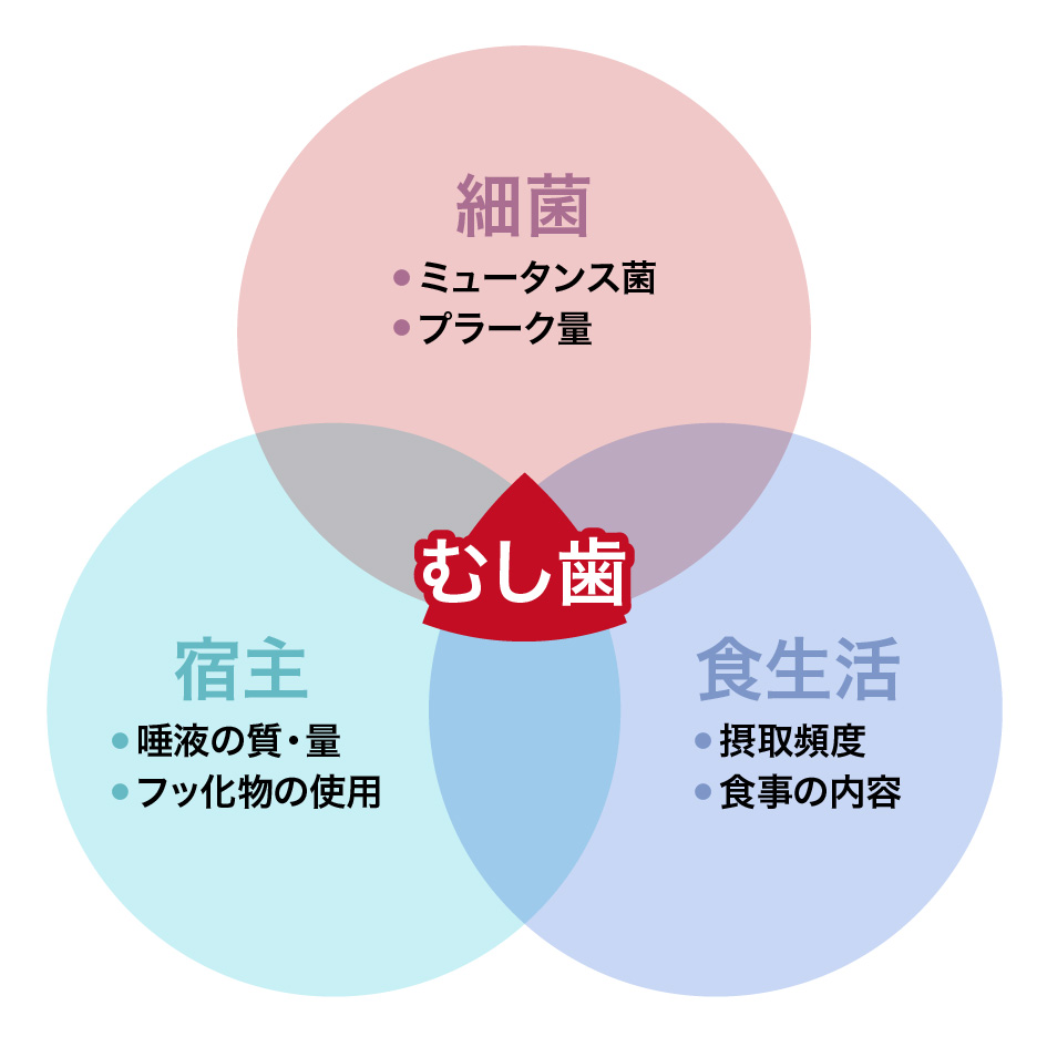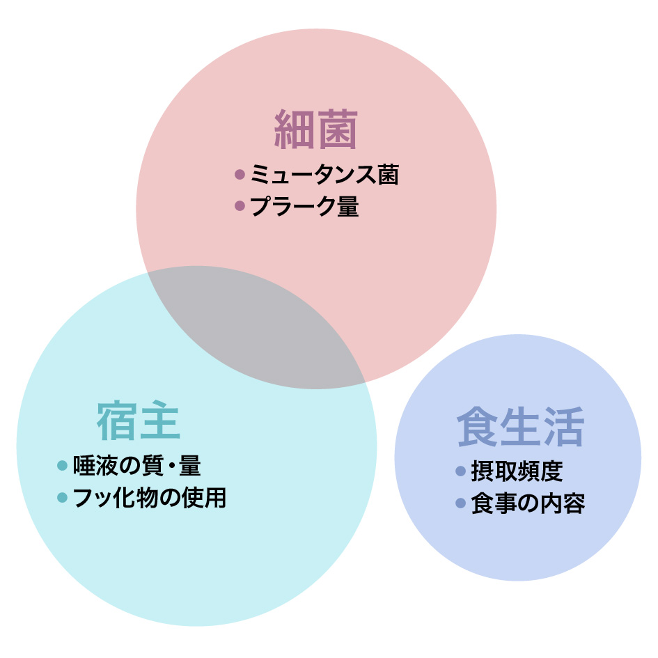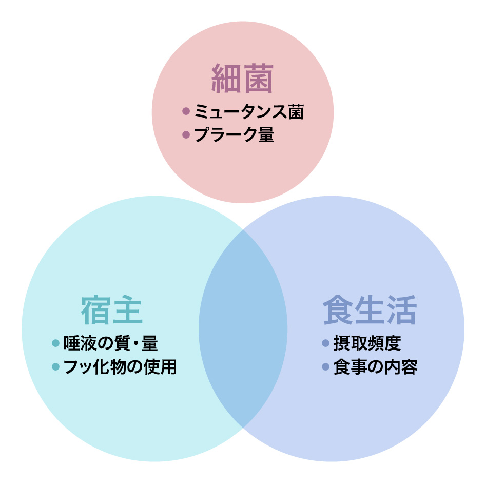 むし歯は、下記の図のように「細菌」「食生活」「宿主」の因子が長時間重なったときに起こる多因子性疾患。「甘いものを食べたからといって、すぐに発症するわけではない」と伝えると、患者さんに安心してもらえます。