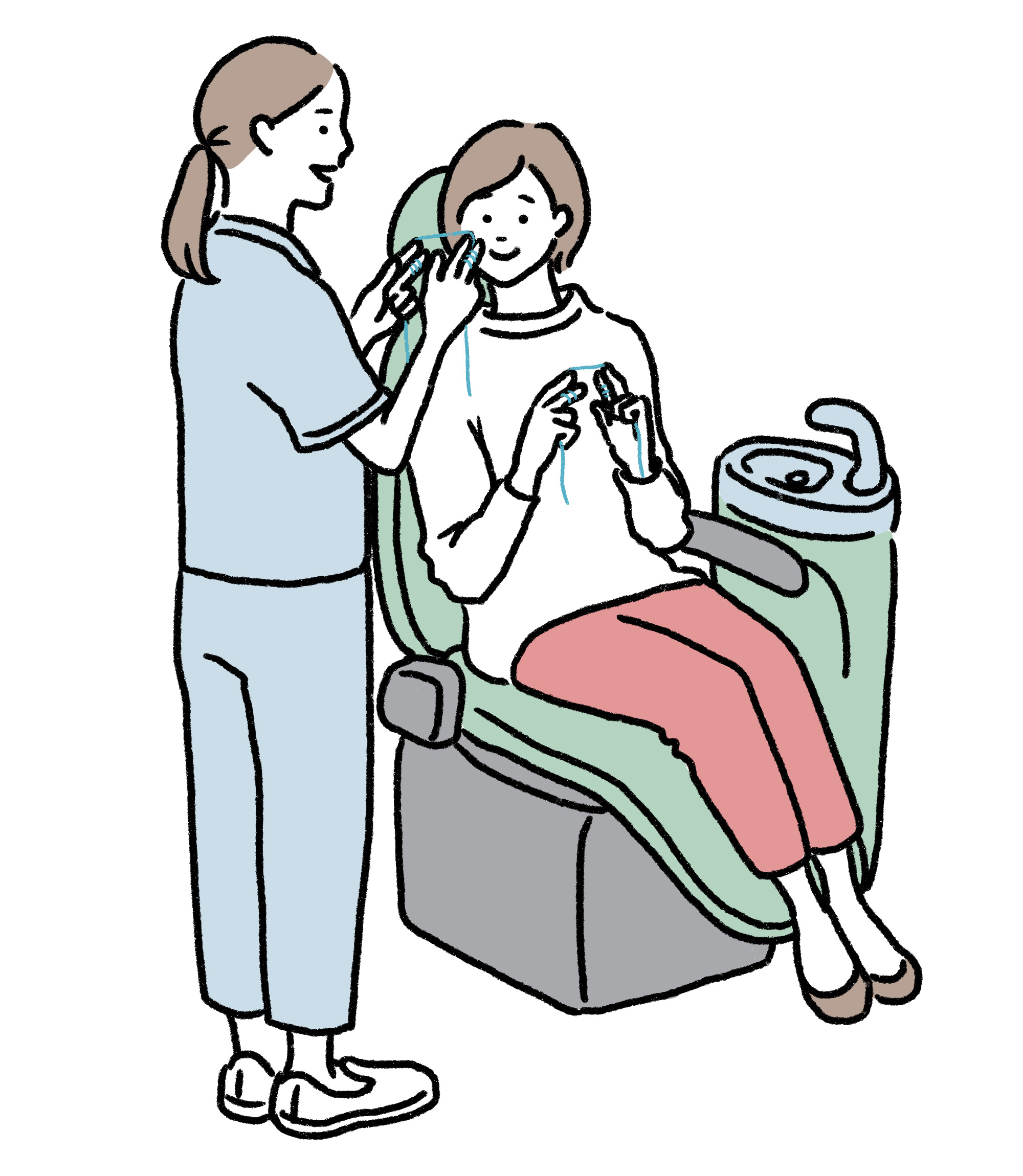 もし指巻きフロスが初めての患者さんだったら、一緒に練習すると早く慣れてもらいやすいです。使ったことがある方でも使い方が間違っていることがあるので、その場で一度普段通りにフロスをしてもらうとよいでしょう。