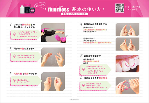 「患者さんに伝えやすい声かけのヒント」と「実際の動きがわかる写真」を掲載した、フロスの使い方紹介ツールをご用意しました。印刷して患者さんにお渡ししたり、パソコンやタブレットに映して一緒に確認したり。さまざまな方法でご活用ください。患者さんの「フロスって難しそう」という気持ちが、「意外とできそう!」に変わるはずです。