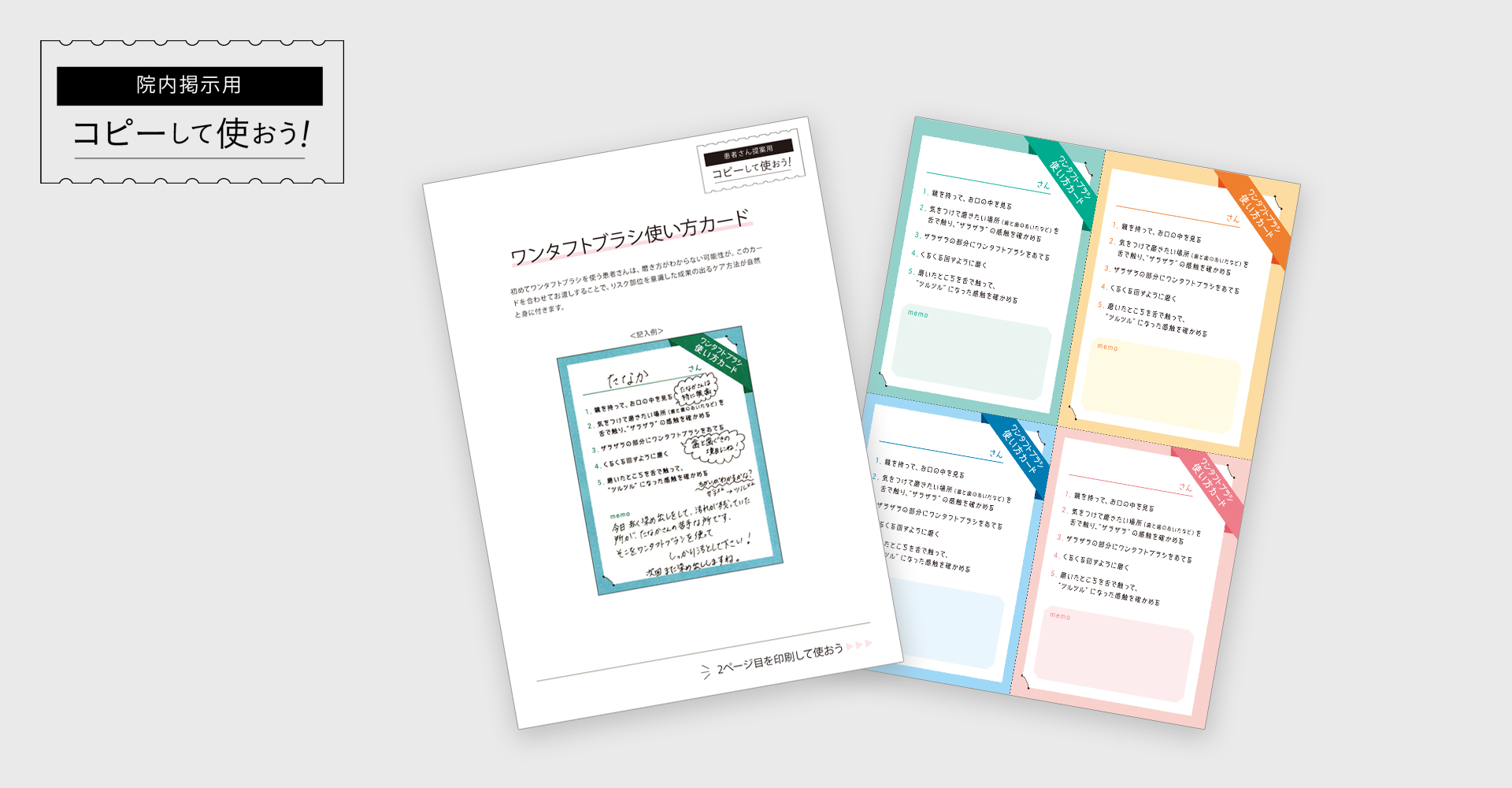 初めてワンタフトブラシを使う患者さんは、磨き方がわからない可能性が。このカードを合わせてお渡しすることで、リスク部位を意識した成果の出るケア方法が自然と身に付きます。
