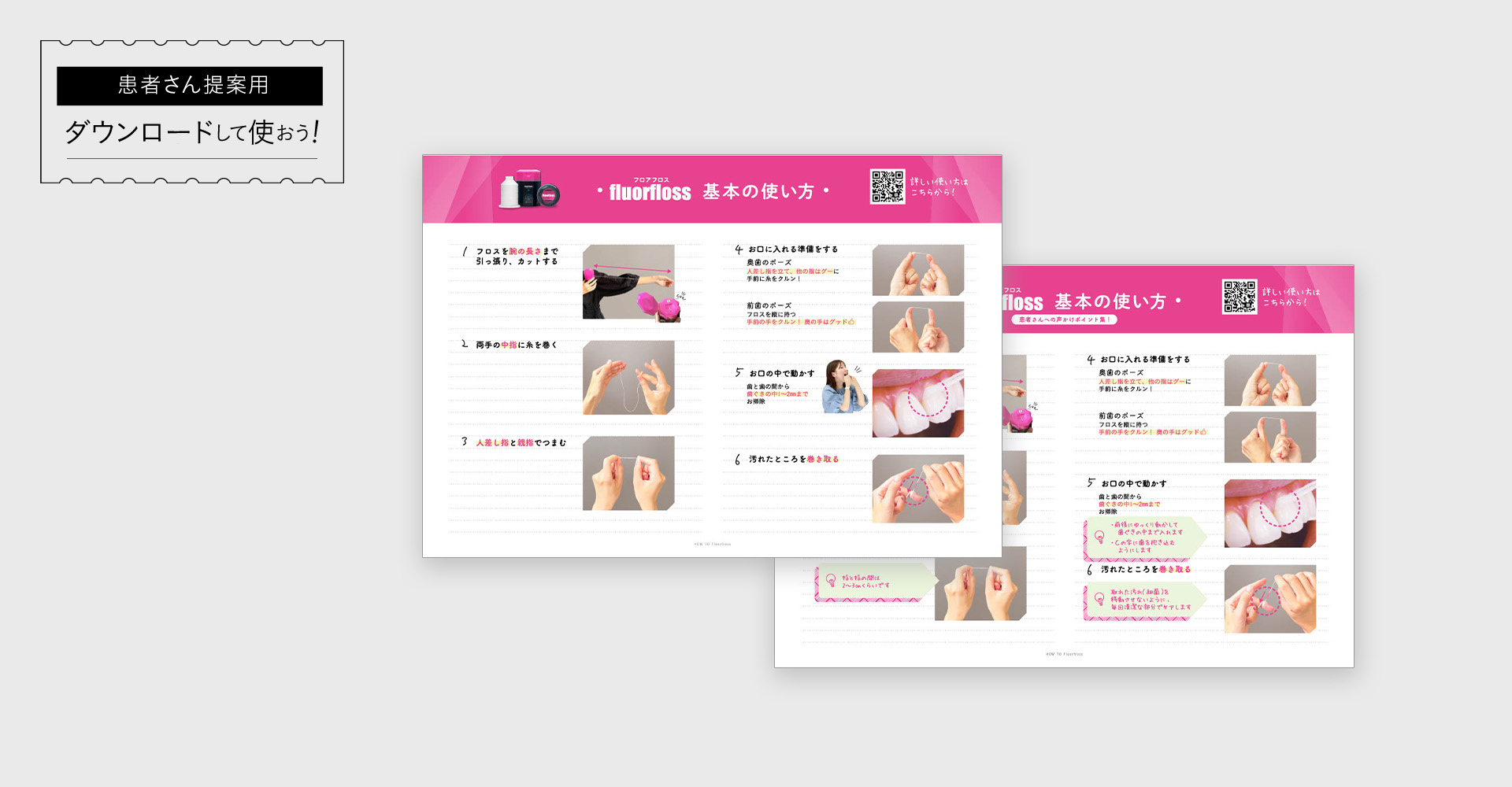 そこで「患者さんに伝えやすい声かけのヒント」と「実際の動きがわかる写真」を掲載した、フロスの使い方紹介ツールをご用意しました。印刷して患者さんにお渡ししたり、パソコンやタブレットに映して一緒に確認したり。さまざまな方法でご活用ください。患者さんの「フロスって難しそう」という気持ちが、「意外とできそう!」に変わるはずです。